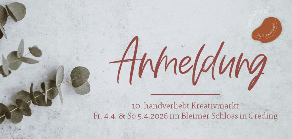 Mit Abschicken dieses Formulars sagst du verbindlich zum 10. handverliebt Kreativmarkt am Samstag, den 04. April und Sonntag, den 05. April 2026 im Bleimer Schloss in Greding zu.
